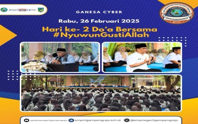 Doa Bersama Hari ke -2. SMPN 1 Gampengrejo mengadakan kegiatan Doa Bersama hari pertama #NyuwunGustiAllah sebagai bentuk kegiatan keagamaan yang dilakukan di sekolah. Kegiatan ini bertujuan untuk memperkuat iman dan takwa siswa, serta memohonkan rahmat, a